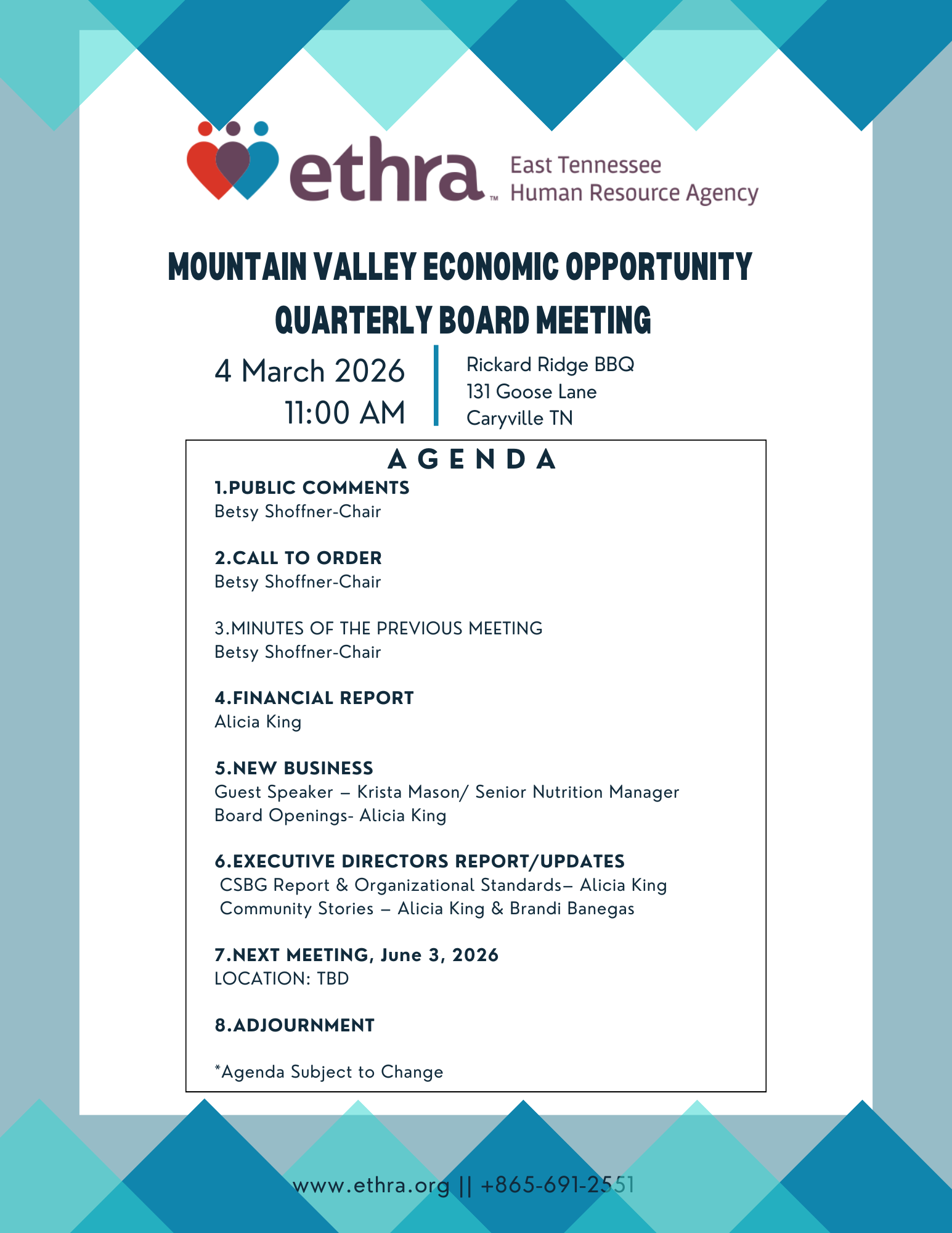 The Mountain Valley Economic Opportunity Quarterly Board Meeting has been scheduled for WEDNESDAY MARCH 4TH 2026 at 11:00 AM.